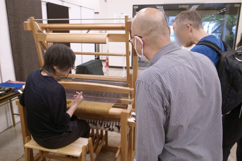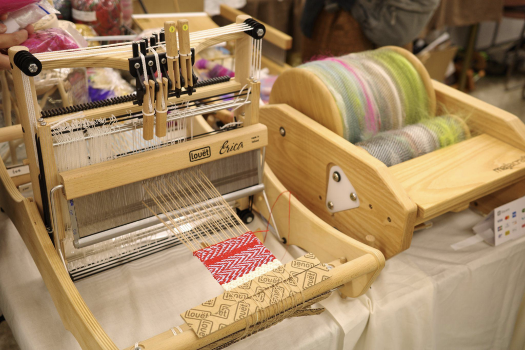 オリジナルの織り機や織り道具、糸紡ぎ、その他便利な道具の数々を販売する、練馬区の「清野工房」。ブースでは、電動紡毛機、座繰機、トンボなどが展示販売されました。大きな織り機「織音(オリオン)」の実演が始まるとたくさんの人が集まり、感心しながら眺めたり動画を撮ったりされていました。
