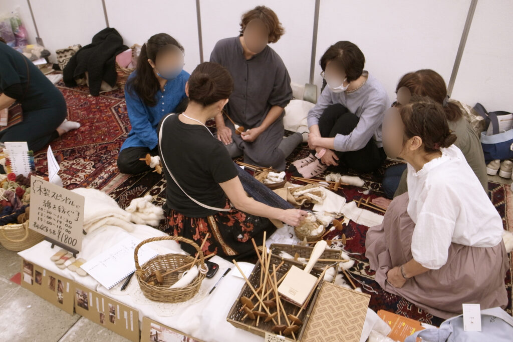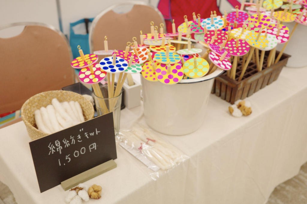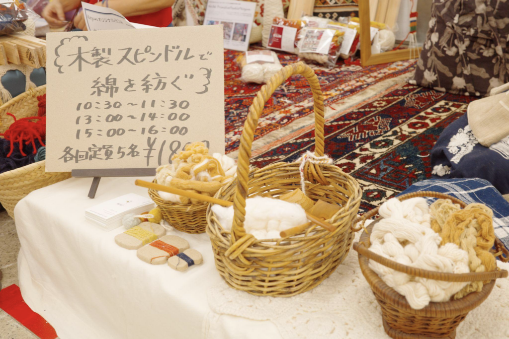 ご自宅の工房にて綿紡ぎをしながら、月に一度ワークショップを行っている「綿工房」。スピパでのワークショップも好評で、鮮やかな赤い絨毯の上で楽しそうに綿紡ぎをされている様子が印象的でした!木製のスピンドルやハンドカーダー、綿やオーガニックコットンなども販売していました。