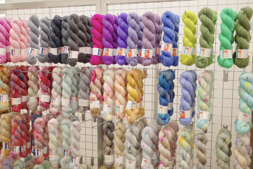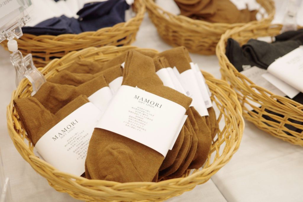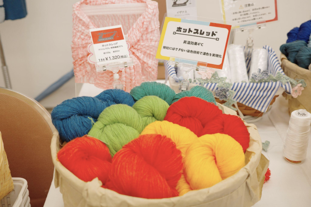 日本橋馬喰町にお店を構える「株式会社シラカワ」。様々な特徴をもつ糸の品揃え、豊富な色のラインナップが魅力です。寒い季節にぴったりな発熱素材の糸・ホットスレッドや、これまでにないほど柔らかなソフトリネン靴下といった商品の数々に、お客さんも興味津々でした。