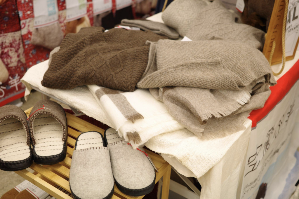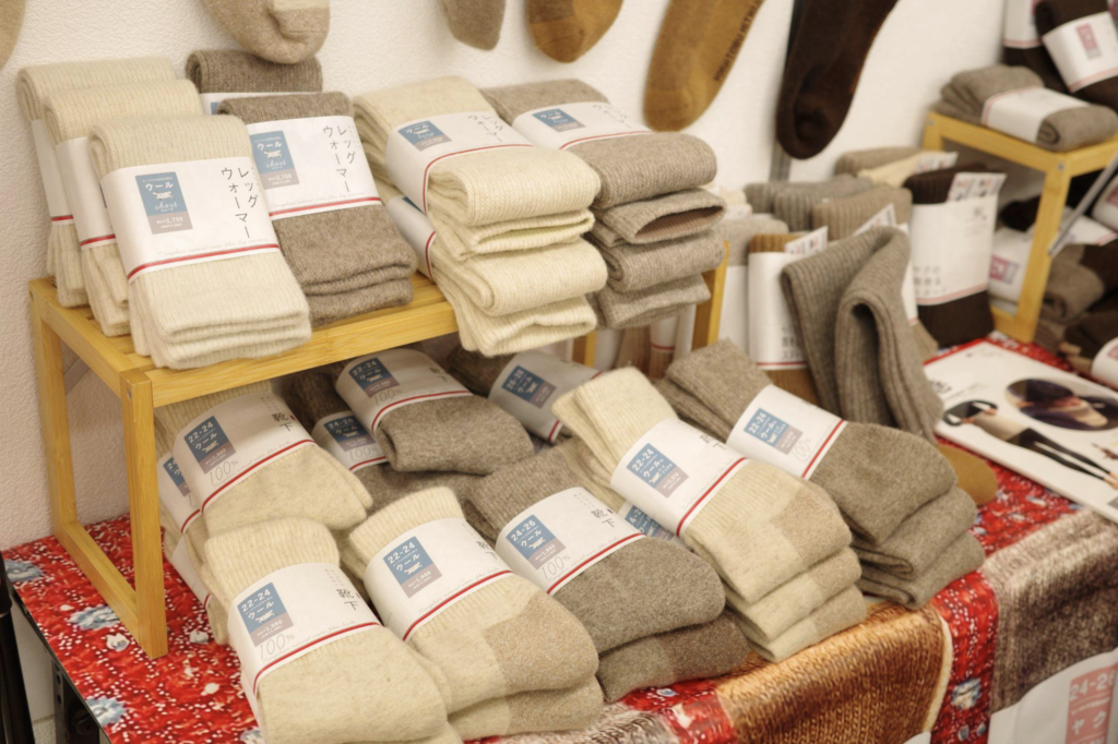 モンゴル出身のアリューンダリさんが代表を務める「空飛ぶ羊」。大量生産されたものではない”原種の羊”を可能な限りそのまま使い、靴下やセーターなどの製品にしています。羊の他にもラクダ、ヤク、カシミヤ山羊など、それぞれ手ざわりや特徴の異なる毛糸で作られたアイテムが並びました。