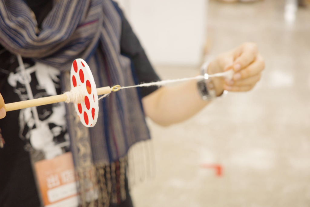 「THE SPINDLES」では、オリジナルの綿用スピンドルと綿紡ぎキットを販売しました。なかなか難しい綿紡ぎですが、その第一歩を踏み出すきっかけになれればと、ポップなデザインのスピンドルを考案されたそうです。色鮮やかなスピンドルを目にした人たちの「かわいい!」という声が、たくさん聞こえてきました。