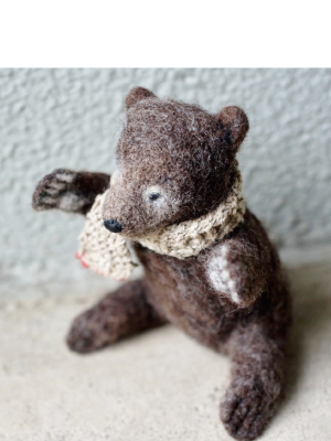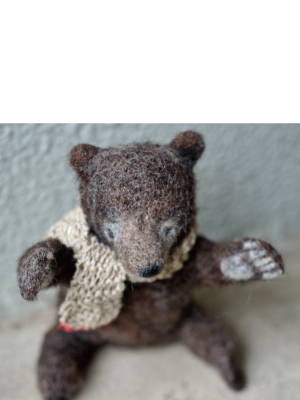 今回作る「ヒグマ」は全長約20cm、中も外もまるごと羊毛を使った、蚤の市のテディベアのようなカチカチに仕上げます。一体作れば、二本足の生き物はほぼ、作ることができるように!ニードルフェルトの基本的なことを体験したい方にも、短時間で硬めに仕上げたい方にもおすすめです。愛くるしい中にもいたずらっぽい表情のヒグマは、作った私自身も気に入っています。(見本はあくまで参考に。)