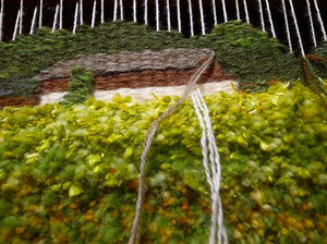 風景の写真、子供が書いた絵などを細かい作業が可能な木枠を使って織物の絵に再現します。