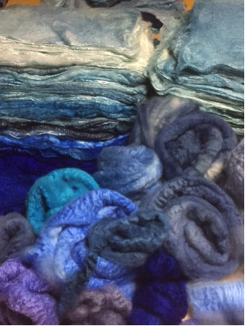 真綿は福島で古くから結城紬の原料として 手作業で作られている絹の繊細で軽く、保温性の高い素材です。カシミヤは、15.5マイクロンの細めの原毛を使用します。数種類の藍と青系化学染料で染め分けました。本来、弱酸性の絹やカシミヤを藍染めする事は、ph等を考えると素材を傷め てしまうという事で 避けてしまいますが 今回はフェルト制作ですので 藍染素材も用意しています。