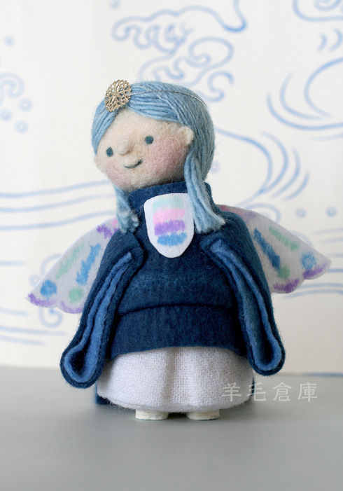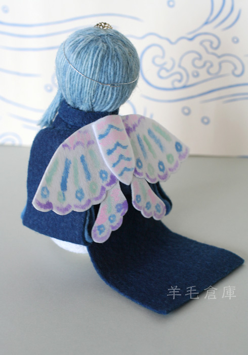 藍で染めた羊毛や布をメインに、日本の伝統的な蝶の舞衣装を着た小さな子どもをつくります。