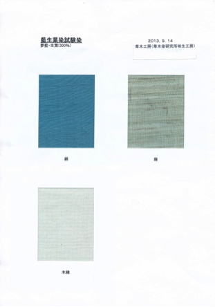 藍の生葉染:水を加えミキサー処理して、絹布、木綿布、麻布を染色。