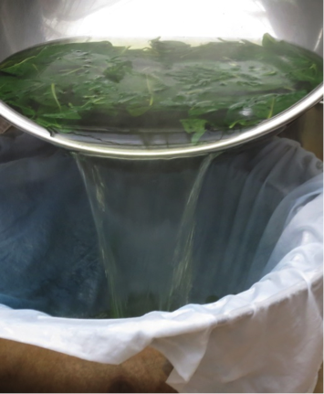 塩もみ法:生葉を塩もみしてから水を加え絹布を染色。