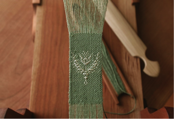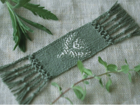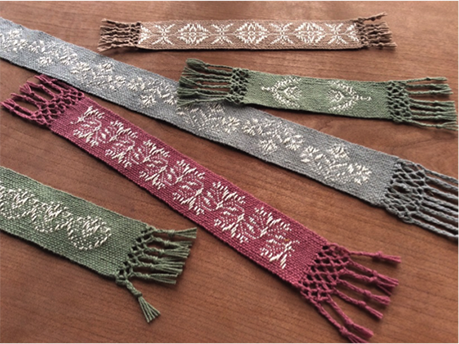 経糸は予め織り機にセットされた状態から織り始め、織り幅の出し方・耳の扱い方・打ち込み具合等リボン織りの基礎を学び、縫取り織りの技法を用いた花模様を織り出します。織り終わりには、糸始末の結びの方法も学びます。
