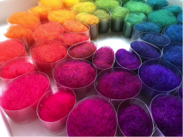化学染料で染められた羊毛を用いて色のものさしを作ります。これを基に混色による濁りのない美しい色と糸づくりを体感しましょう。これは手紡ぎの糸だけでなく、織物、フェルト、そして染料の混色にも同じ理論が役立ちます。