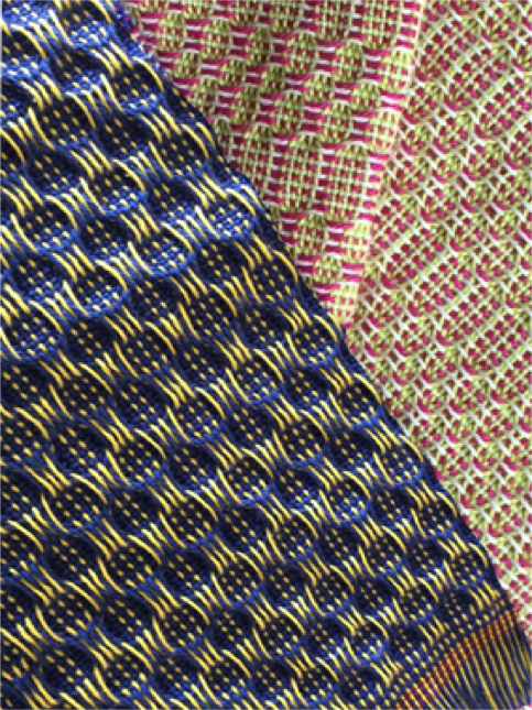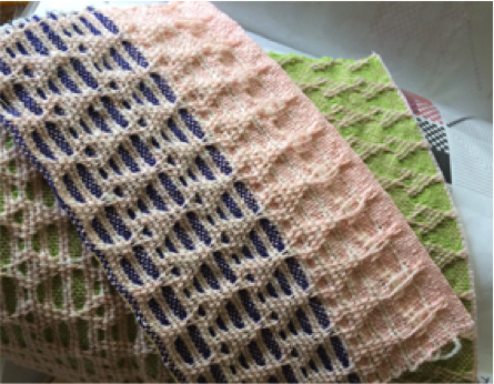 今回は、特別組織の蜂巣織りをテーマにしました。ハチの巣のように連続した穴がポコポコ・・・と少し立体的な布になる組織です。いろいろな蜂がいて、様々な形のハチの巣があるように単純な蜂巣の基本から、4枚~8枚綜絖で出来る複雑な蜂巣織りまで勉強します。簡単に織れて かわいい!織りたい!と思うような組織が作れます。今年もたくさんのサンプルと、充実した内容で楽しく勉強しましょう。