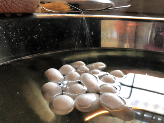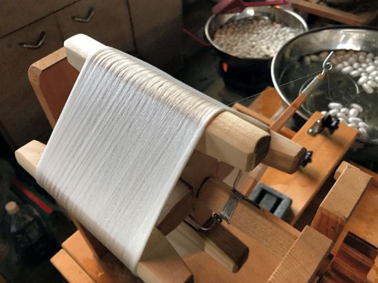 繭と生糸に関する基本的な説明の後、煮繭(しゃけん・糸取りするために繭を煮る工程)のデモンストレーションを見学いただきます。 その後、グループに分かれて座繰り器を使った糸取り体験をしていただきます。 引いた生糸は揚げ返しを使ってかせにして持ち帰れます。