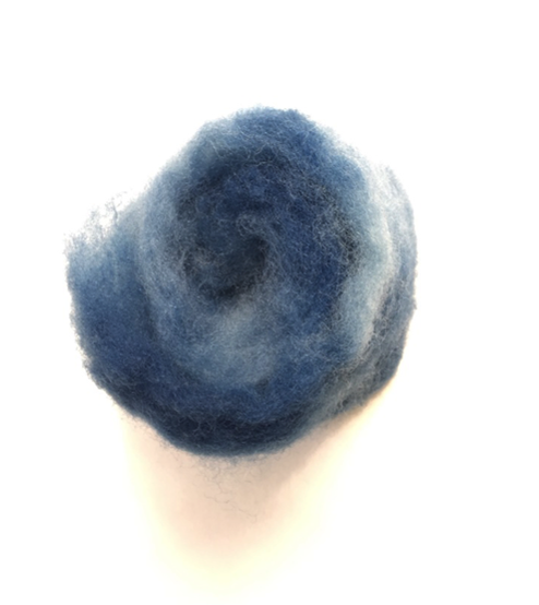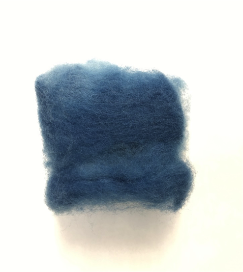 ブドウ糖でインド藍を還元しウール(原毛)を藍染します。 インド藍に、水、ブドウ糖、消石灰を加え加熱、染料液を還元して 65℃まで冷まして原毛を染めます。ブドウ糖は、ブドウ、バナナ、リンゴなどに多く含まれ、この還元力を使うので、家庭でも安全に藍染ができる方法です。 藍(すくも、泥藍、インド藍、)を発酵させて藍を建て、ウールを染めることもできますが、絹、木綿と比べるとよく染まりません。この原因は発酵建ての染料液の温度が低いからと思われます。 「インド藍のブドウ糖還元建て」は染料液を沸騰させてから 65℃まで冷ましてウールを染めますので、ウールに適した染色法でよく染まります。藍の原毛が染まれば、黄、赤、茶、鼠などの原毛と混ぜてカードすれば多彩な色を作ることができます。 また、藍染のメカニズム(藍建て、藍の生葉染、藍の煮出し染の講義も行います。