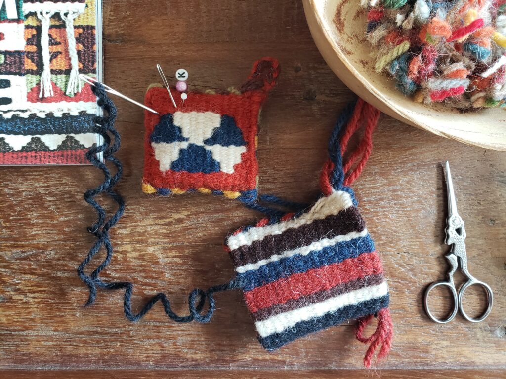 「はじめての、小さなキリムと小物たち」(日本文芸社)に掲載のピンクッションを、はじめての方はストライプ、経験者はモチーフ入りで織りましょう。