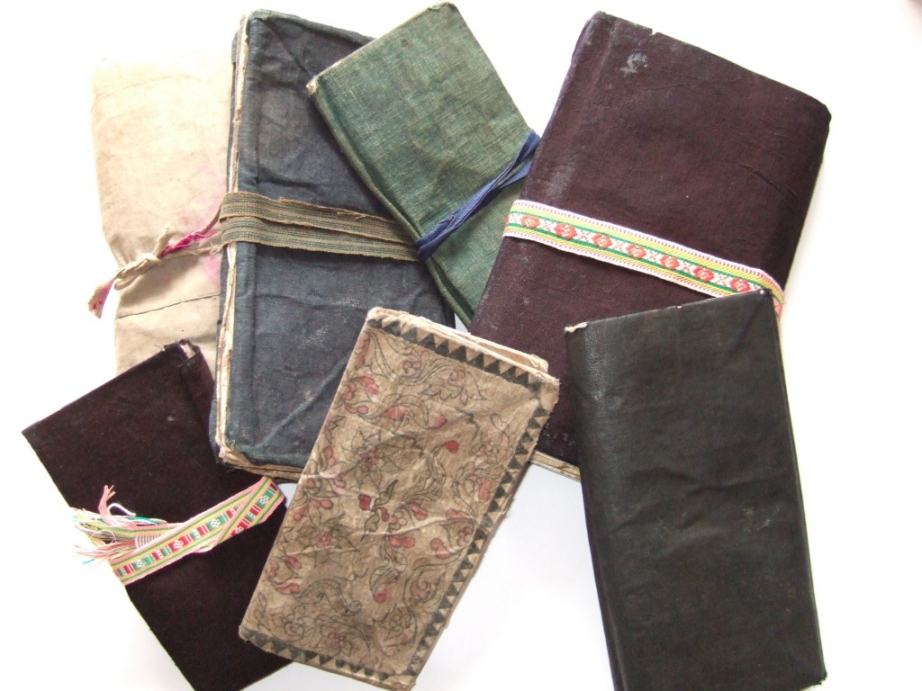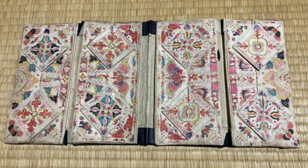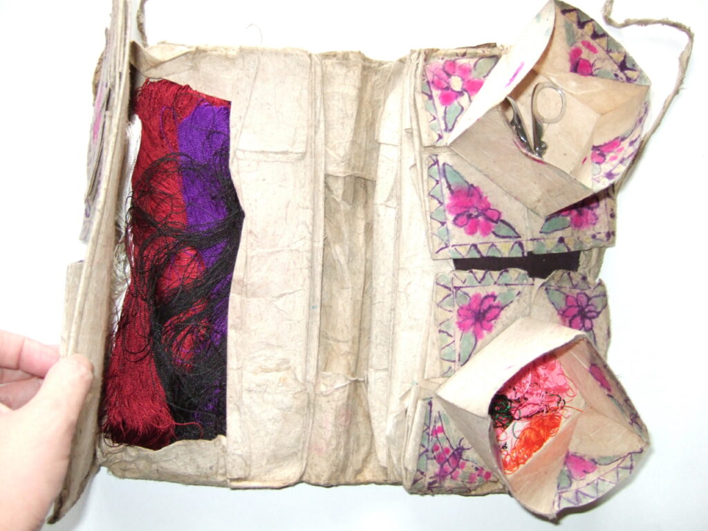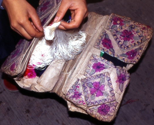刺繍用の針や糸などは、本の間に挟む、または竹かごに入れて保管するのが一般的ですが、一部の地域では、紙と布で作った独特のブック型裁縫箱の使用が見られます。それは、日本の折り紙にも通じる折り方で大小の箱をつくり、箱全体を覆う布や描画の違いで作られた、唯一無二なものです。